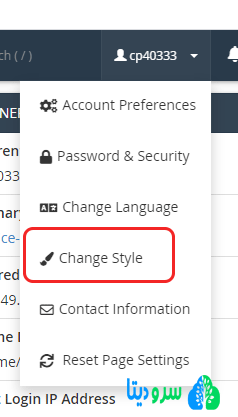 روش دوم: پس از ورود به سی پنل در سمت راست، بالای صفحه بر روی نام کاربری کلیک کنید و در منوی کشویی باز شده گزینه change style را انتخاب نمایید.