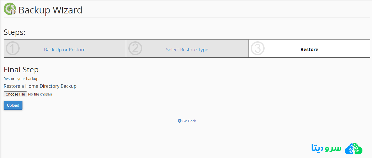 بر روی گزینه Choose file کنید، فایل بکاپ گرفته شده خود را انتخاب نمایید، سپس بر روی گزینه Upload کلیک نمایید، منتظر بمانید تا فایل های شما آپلود گردد، بعد از اتمام این پروسه فایل های شما ریستور شده و تنظیمات شما نیز اعمال می گردد.