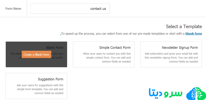 با این کار سازنده drag and drop WPForms باز می شود. در تب “form name” نام فرم خود را وارد کنید (مثلا contact us ) و سپس فرم تماس خود را انتخاب کنید.
